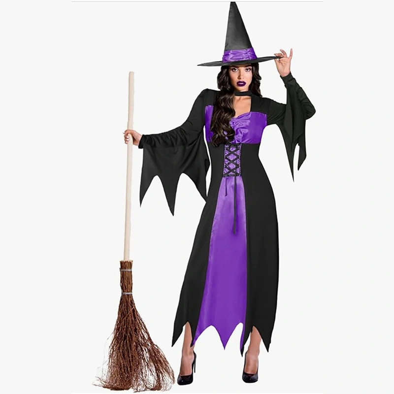 The costume also comes with a matching hat, which is a crucial element of any witch's attire. The hat is typically a tall, pointed witch's hat adorned with a decorative ribbon or other mystical accents. It adds an extra layer of magic to the ensemble and helps complete the look.